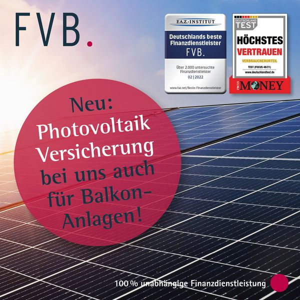 Sie gehören auch zu den Energie-Selbstversorger*innen? Schützen Sie Ihre Solaranlagen zu Hause oder auf Ihrem Geschäftsgebäude – mit unserer Photovoltaikversicherung sind neben den üblichen Anlagen sogar Ihre Balkonanlagen versicherbar! Schauen Sie einfach online rein oder lassen Sie sich gern persönlich bei Ihrem FVB-Makler*in beraten!